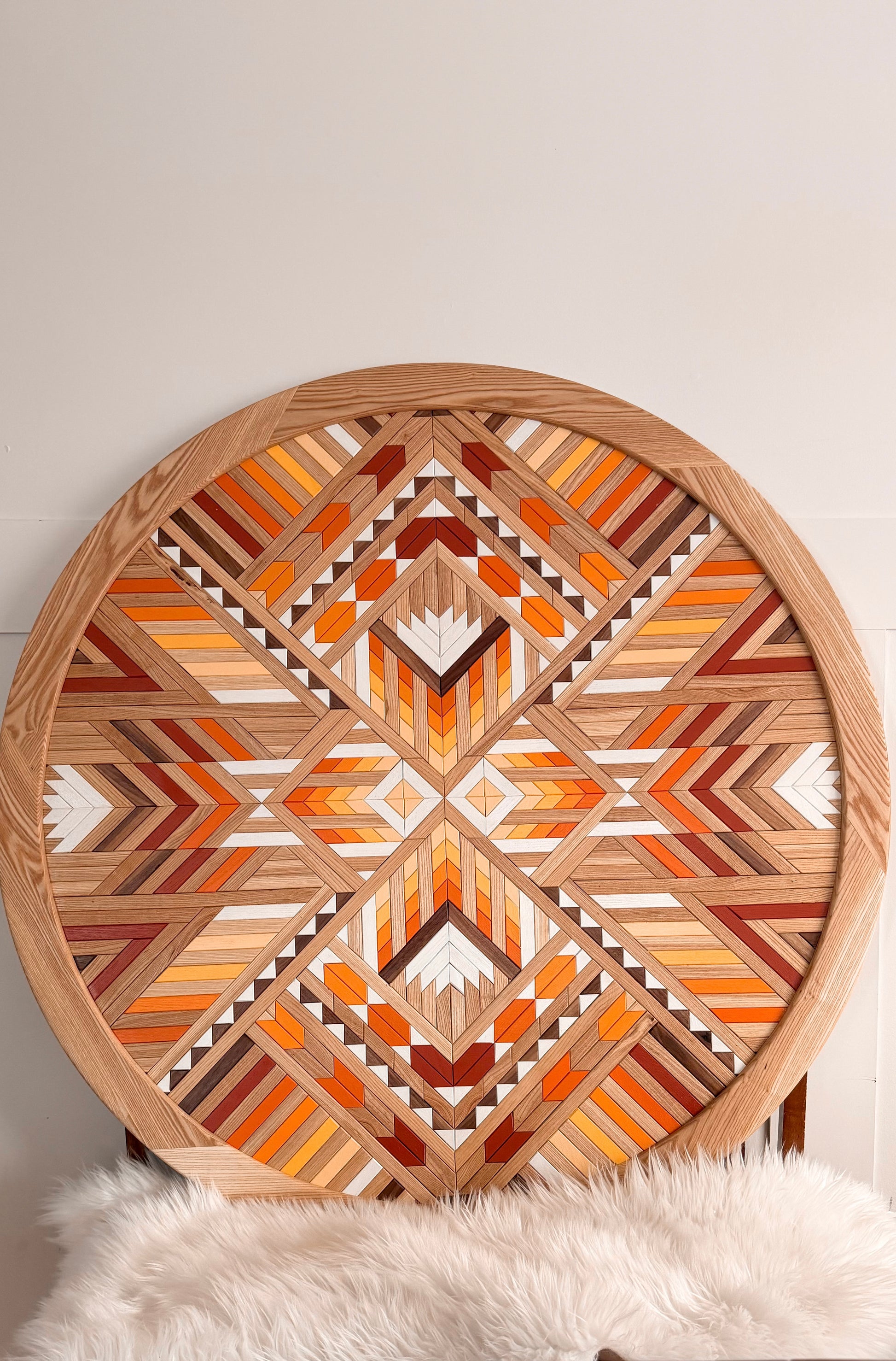 This mosaic echoes the quiet rhythm of a setting sun. Layers of warm honey and amber move through this piece like light passing through the sky, while the natural black walnut ground the piece, mirroring the silhouettes that emerge as daylight fades.