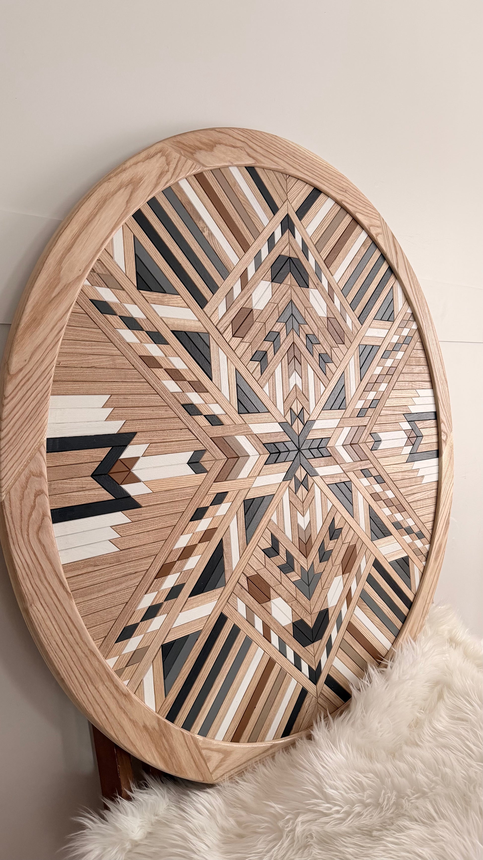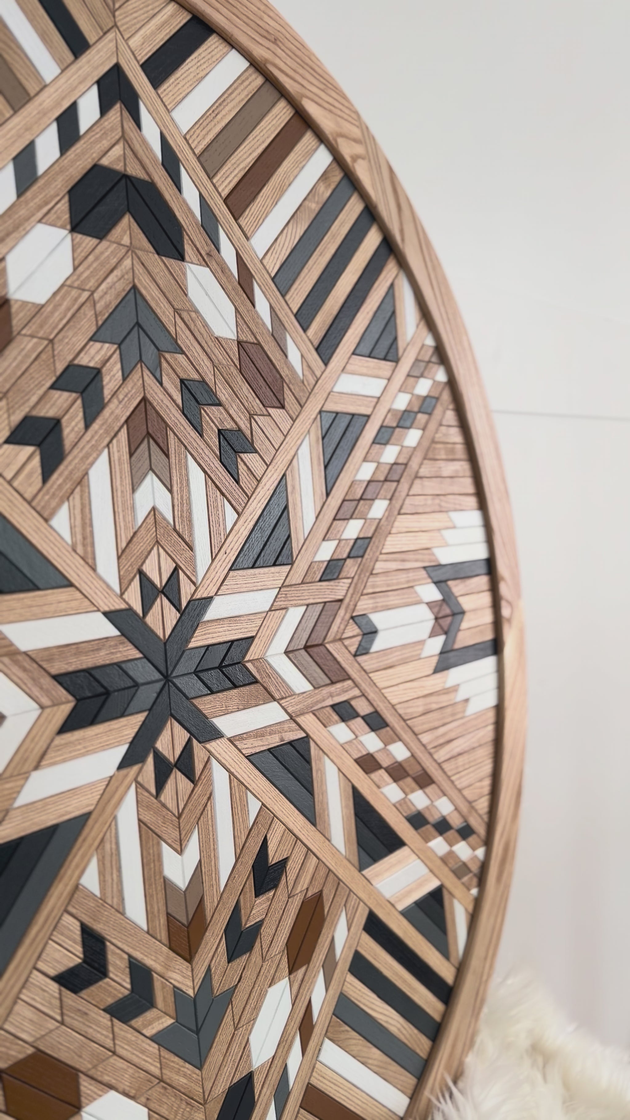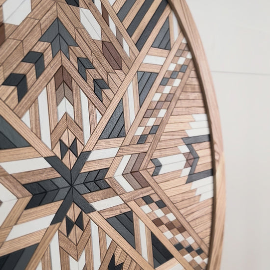 This mosaic echoes the quiet rhythm of a setting sun. Layers of warm honey and amber move through this piece like light passing through the sky, while the natural black walnut ground the piece, mirroring the silhouettes that emerge as daylight fades.