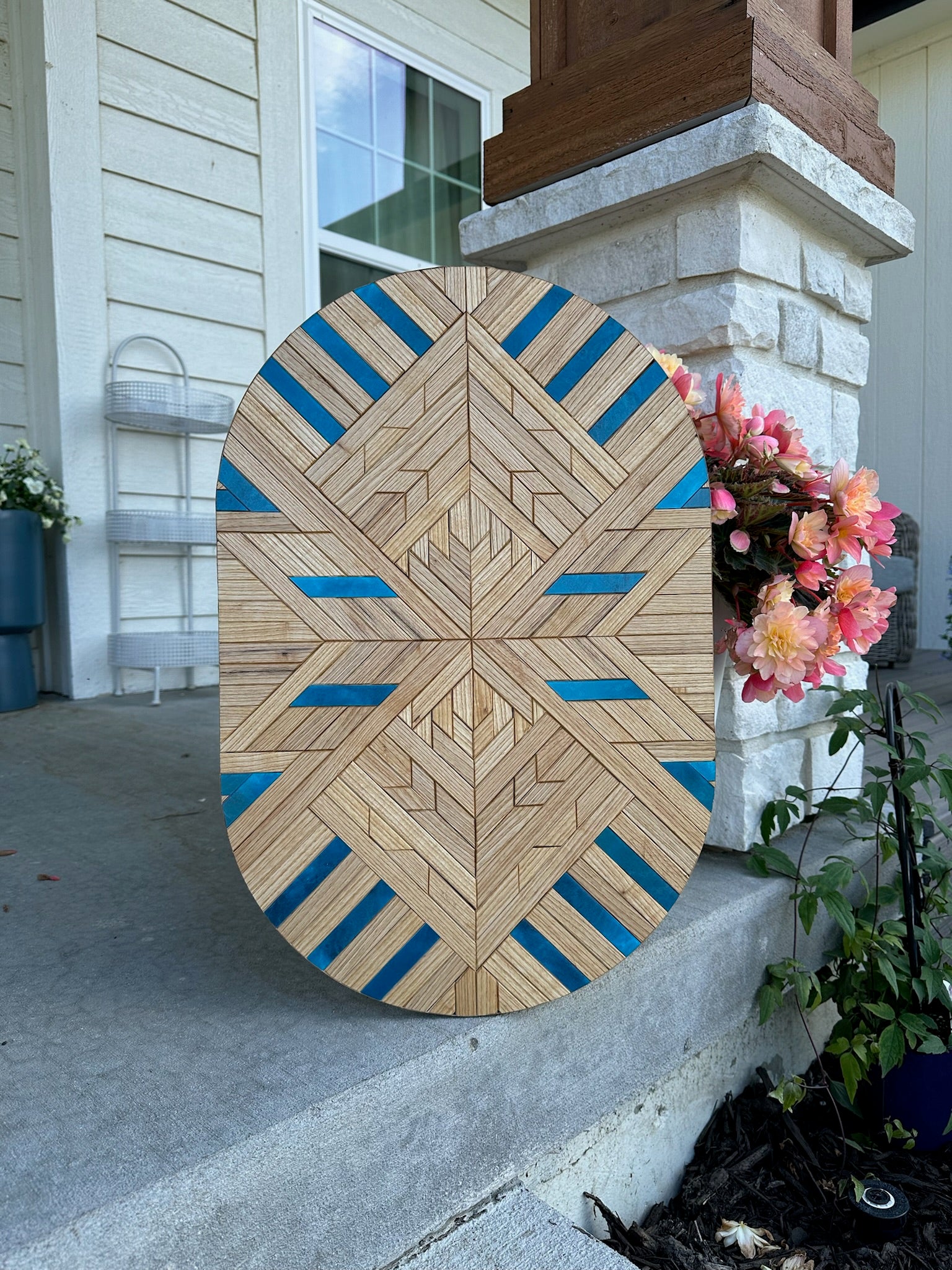 +This pill shaped msoaic features Ash and blue epoxy mosiac